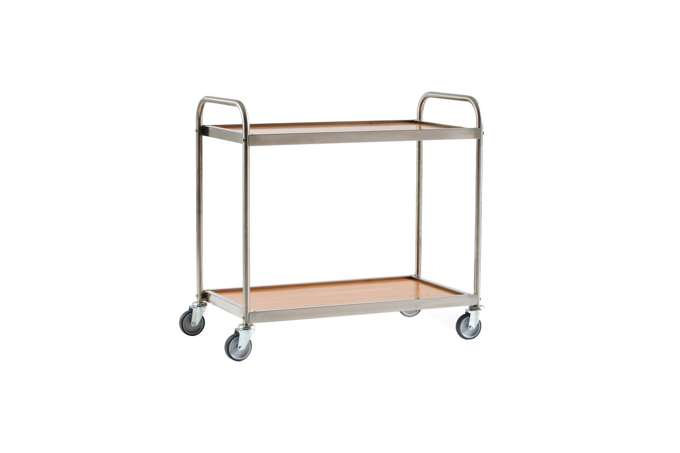 Carrello di servizio con 2 piani in truciolare bilaminato chiuso in una cornice di acciaio inox. I piani in laminato possono essere girati se la superficie di un lato si dovesse danneggiare. Struttura in acciaio inox tubolare di 25 mm, ruote di 100 mm. Disponibile in due misure.