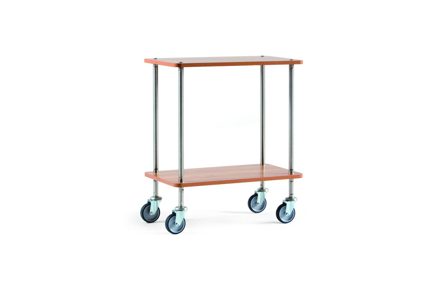 Carrello di servizio "Gueridon" piccolo ed agile, ideale per sporzionare al tavolo. 2 piani in truciolare bilaminato di 18 mm di spessore, angoli stondati, gambe in acciaio inox del diametro di 25 mm, ruote con diametro di 100 mm. Dimensioni: 70x40xh76,5 cm. Spazio utile tra piani: 55 cm.