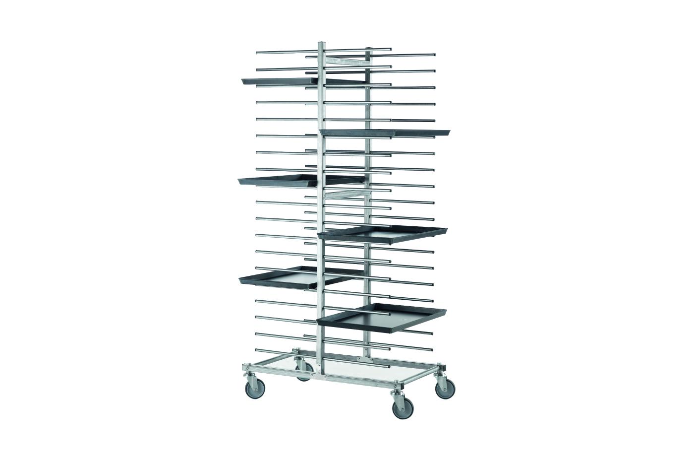 Struttura a braccetti doppio fronte per 40 teglie cm 40x60, passaggio utile tra i piani 66 mm , ruote pivottanti da 100 mm.