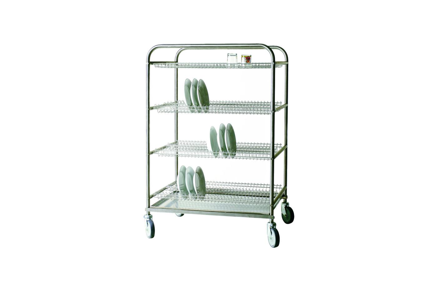Carrello scolapiatti , completamente in acciaio inox, griglie comprese. Struttura tubolare da 25 mm, ruote pivottanti da 125 mm. Vassoio raccolta acqua con tappo di scarico. Portata massima kg 150
