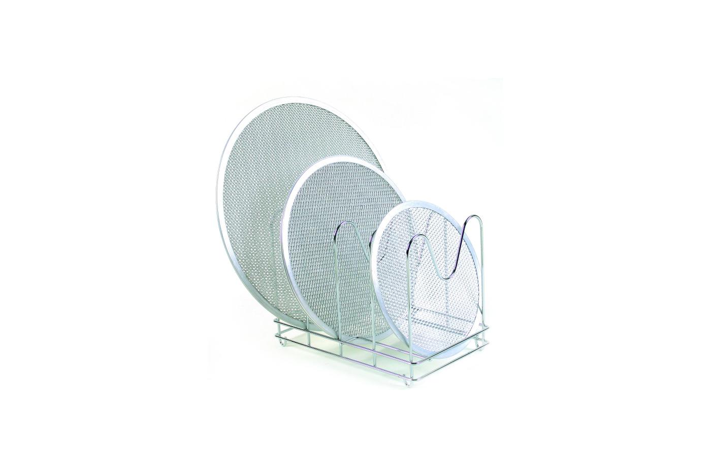 Rastrelliera orizzontale in acciaio cromato per 96 retine. Permette di avere le retine ordinare e pronte per l'utilizzo.